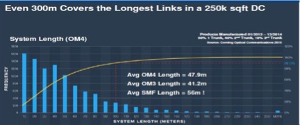其次,寬帶多模光纖(WBMMF)支持高速以太網(wǎng)傳輸能夠達(dá)到更遠(yuǎn)的距離。網(wǎng)絡(luò)收發(fā)器廠商Finisar于2015年初推出了100G SWDM4 QSFP28的光纖收發(fā)器,該收發(fā)器僅需要兩芯寬帶多模光纖 (WBMMF), 每芯光纖采用4個(gè)不同波長(zhǎng),每個(gè)波長(zhǎng)傳輸25Gbps。在最近全球各地的現(xiàn)場(chǎng)演示中,100G SWDM4 QSFP28的光纖收發(fā)器在康普 2芯寬帶多模光纖 (WBMMF) 上最遠(yuǎn)達(dá)到了450米的傳輸距離。