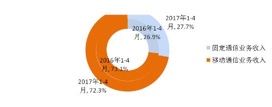 圖2 2017年1-4月電信業(yè)務(wù)收入結(jié)構(gòu)占比情況(固定和移動(dòng))