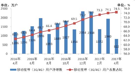 圖3 2016-2017年4月移動(dòng)寬帶用戶當(dāng)月凈增數(shù)和總數(shù)占比情況