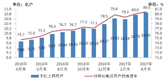 圖5 2016-2017年4月手機(jī)上網(wǎng)用戶和對(duì)移動(dòng)電話用戶滲透率情況