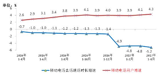 圖6 2016-2017年4月移動(dòng)電話用戶和通話量增幅比較
