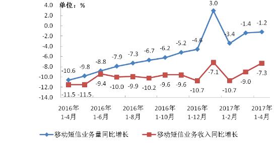 圖7 2016-2017年4月移動(dòng)短信業(yè)務(wù)量和收入同比增長(zhǎng)情況