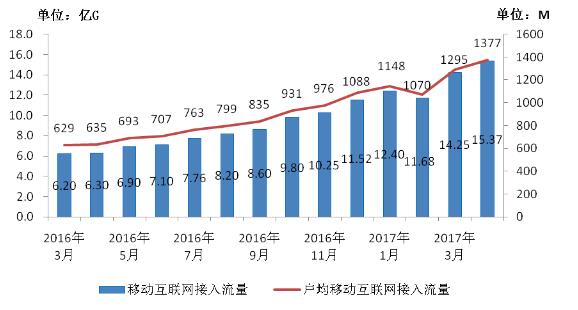 圖8 2016-2017年4月當(dāng)月移動(dòng)互聯(lián)網(wǎng)接入流量和戶均流量比較