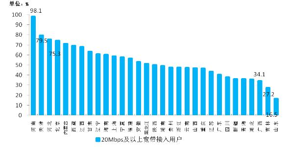 圖9 2017年4月末50Mbps及以上寬帶接入用戶占比各省分布情況