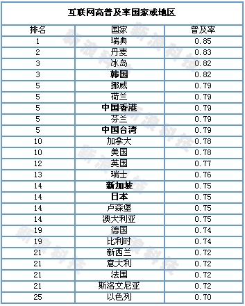 ITU全球互聯(lián)網(wǎng)普及排名,此表為互聯(lián)網(wǎng)高普及率排名(表中加粗的為亞洲國家或地區(qū))