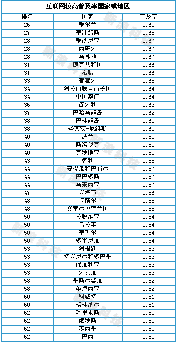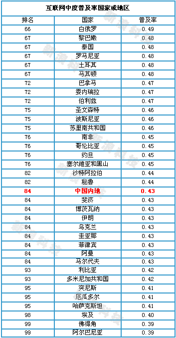 ITU全球互聯(lián)網(wǎng)普及排名,此表為互聯(lián)網(wǎng)中等普及率排名(中國內(nèi)地列84位)