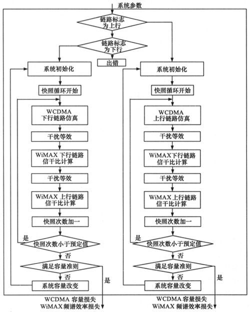 本文采用蒙特卡羅統(tǒng)計(jì)仿真方法,WCDMA和WiMAX系統(tǒng)分別進(jìn)行單系統(tǒng)仿真,然后再進(jìn)行兩個(gè)系統(tǒng)共存的仿真,仿真流程如圖2所示。在圖2中,根據(jù)WCDMA輸入鏈路標(biāo)志,選擇上行或下行仿真。其中WCDMA功率控制過(guò)程中,要考慮WiMAX系統(tǒng)上行和下行鏈路分別對(duì)WCDMA載干比的影響。在完成WCDMA單系統(tǒng)仿真后,即考慮了WCDMA在受WiMAX系統(tǒng)干擾,保持WCDMA移動(dòng)臺(tái)或基站受干擾時(shí)發(fā)射功率,繼續(xù)仿真對(duì)WiMAX下行和上行鏈路的影響,即考慮系統(tǒng)間干擾互反饋過(guò)程。