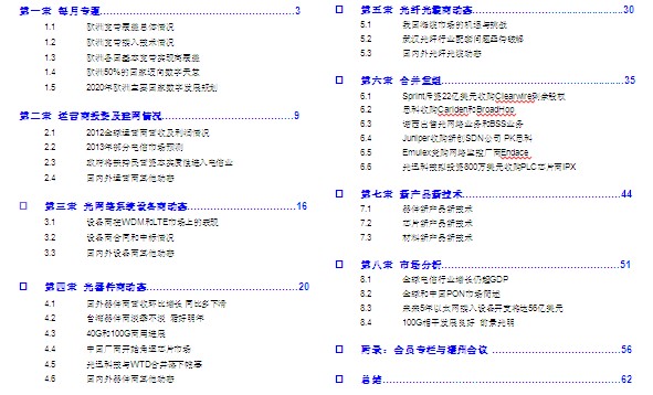 器件商部分:國外器件商營收環(huán)比都有所增長,同比多下滑。臺灣器件商從11月份開始進(jìn)入淡季,但多家公司維持高檔營收,淡季不淡,并且看好明年。國內(nèi)40G開始應(yīng)用,100G蓬勃發(fā)展,但要形成規(guī)模還須待時日。中國廠商開始角逐芯片市場,光迅與WTD合并落下帷幕,新公司資產(chǎn)24億元。