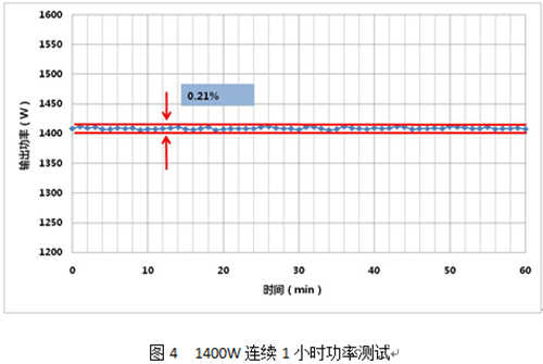 為驗(yàn)證長飛20/400光纖更高功率的穩(wěn)定性,測試人員增加了一組1400W的穩(wěn)定性測試實(shí)驗(yàn)。測試結(jié)果顯示,長飛20/400光纖1小時(shí)內(nèi)功率波動值在0.21%,如圖4。