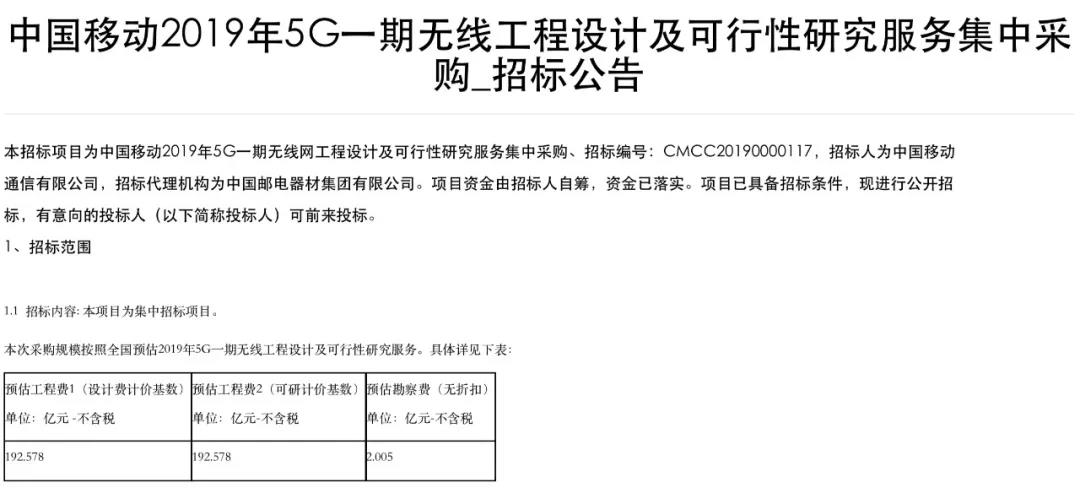 5G基站建設(shè)工程,從勘察、設(shè)計(jì)開始。2019年6月10日,中國移動(dòng)發(fā)布《中國移動(dòng)2019年5G一期無線工程設(shè)計(jì)及可行性研究服務(wù)集中采購_招標(biāo)公告》。