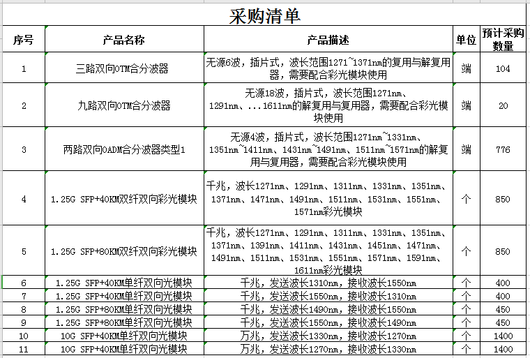 根據(jù)此前招標(biāo)公告,該項目預(yù)計采購三路雙向OTM合分波器 、九路雙向OTM合分波器 、兩路雙向OADM合分波器類型1 、雙纖雙向彩光模塊 、單纖雙向光模塊等,具體產(chǎn)品信息詳見(采購清單)。
