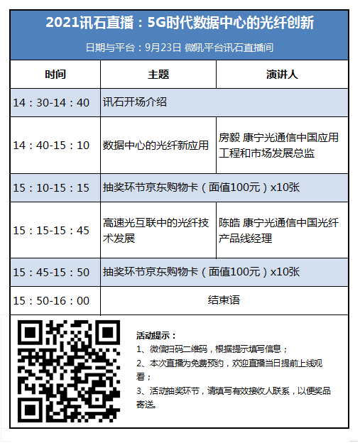對此,9月23日,訊石光通訊網(wǎng)將攜手康寧光通信舉辦“2021訊石線上直播—5G時代數(shù)據(jù)中心的光纖創(chuàng)新”,邀請康寧數(shù)據(jù)中心和光纖方面的專家發(fā)表精彩報告,與行業(yè)觀眾分享光纖、數(shù)據(jù)中心、和綜合布線的發(fā)展趨勢、需求變革以及新型方案,探討新一代數(shù)據(jù)中心光纖基礎架構有哪些新的技術和產(chǎn)品需求。