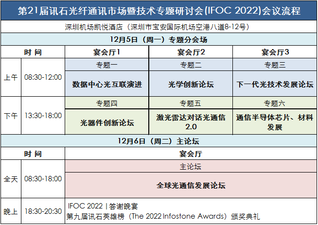 2022年12月5-6日,第21屆訊石光纖通訊市場暨技術專題研討會(The 21st Infostone Optical Communication Market and Technology Conference,簡稱“IFOC”、“訊石研討會”)邀您共聚深圳機場凱悅酒店(地址:深圳市寶安國際機場空港八道8-12號),從七大專題深入探討覆蓋整個光通訊市場的全面內(nèi)容,層層遞進式分析技術發(fā)展趨勢,深度融入熱點話題為行業(yè)發(fā)展注入新鮮力量。