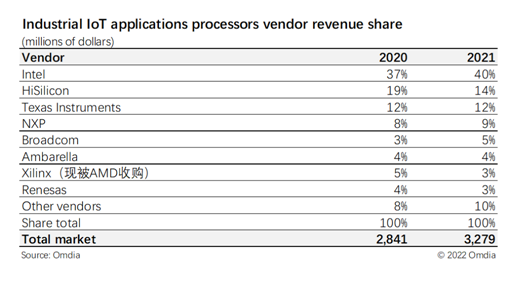 作為除汽車外的又一穩(wěn)定細(xì)分增長(zhǎng)領(lǐng)域,工業(yè)物理網(wǎng)應(yīng)用處理器的競(jìng)爭(zhēng)格局同樣值得關(guān)注。在該領(lǐng)域中,英特爾可謂一騎絕塵,這主要是由于開(kāi)發(fā)人員通常需要基于 x86 的 Windows 或Linux,以避免復(fù)雜系統(tǒng)不兼容的風(fēng)險(xiǎn)。此外,海思、德州儀器、恩智浦、博通等都位居前列。欲了解該報(bào)告更多競(jìng)爭(zhēng)格局情況,請(qǐng)聯(lián)系Fasiha(Fasiha.Khan@informa.com)詢問(wèn)完整報(bào)告。