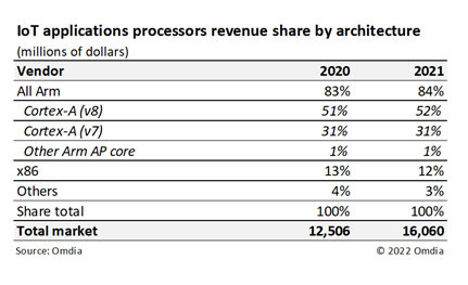 眾所周知,近十年來(lái),由于具備功耗優(yōu)勢(shì),以及Arm技術(shù)長(zhǎng)期以來(lái)一直為連接硬件提供支持,包括 Wi-Fi、蜂窩和專有的低功耗無(wú)線解決方案,Arm在物聯(lián)網(wǎng)應(yīng)用處理器領(lǐng)域占據(jù)了主導(dǎo)地位,在2021年占據(jù)了84%的市場(chǎng)份額,據(jù)Omdia統(tǒng)計(jì),僅64位Armv8系列就占據(jù)了物聯(lián)網(wǎng)應(yīng)用處理器市場(chǎng)一半以上的份額。而X86仍將在物聯(lián)網(wǎng)行業(yè)占據(jù)一席之地,其高性能和行業(yè)標(biāo)準(zhǔn)設(shè)計(jì)將繼續(xù)為嵌入式 PC 和企業(yè)設(shè)備助力。