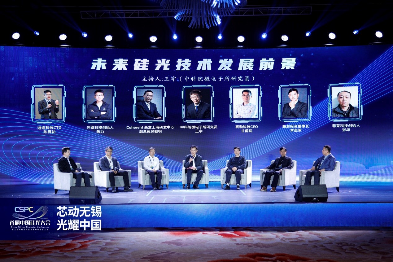 大會(huì)最后,在行業(yè)對(duì)話《未來硅光技術(shù)發(fā)展前景》中,由中科院微電子所研究員王宇擔(dān)任主持,Coherent高意上海研發(fā)中心副總裁吳馳明、賽勒科技CEO甘甫烷、光鑒科技創(chuàng)始人朱力、臨芯投資董事長李亞軍、逍遙科技CTO陳昇祐、菲萊科技創(chuàng)始人張華等業(yè)界技術(shù)、市場和資本大咖共同探討了硅光技術(shù)特性的演變和硅光市場未來預(yù)測和投資價(jià)值,分享了光互連、數(shù)據(jù)通信、消費(fèi)級(jí)電子、激光雷達(dá)等領(lǐng)域的應(yīng)用發(fā)展,并介紹國內(nèi)硅光模塊、硅光芯片技術(shù)水平和量產(chǎn)情況以及ChatGPT應(yīng)用推動(dòng)數(shù)據(jù)中心算力劇增,將為硅光技術(shù)發(fā)展帶來怎樣的市場機(jī)遇。