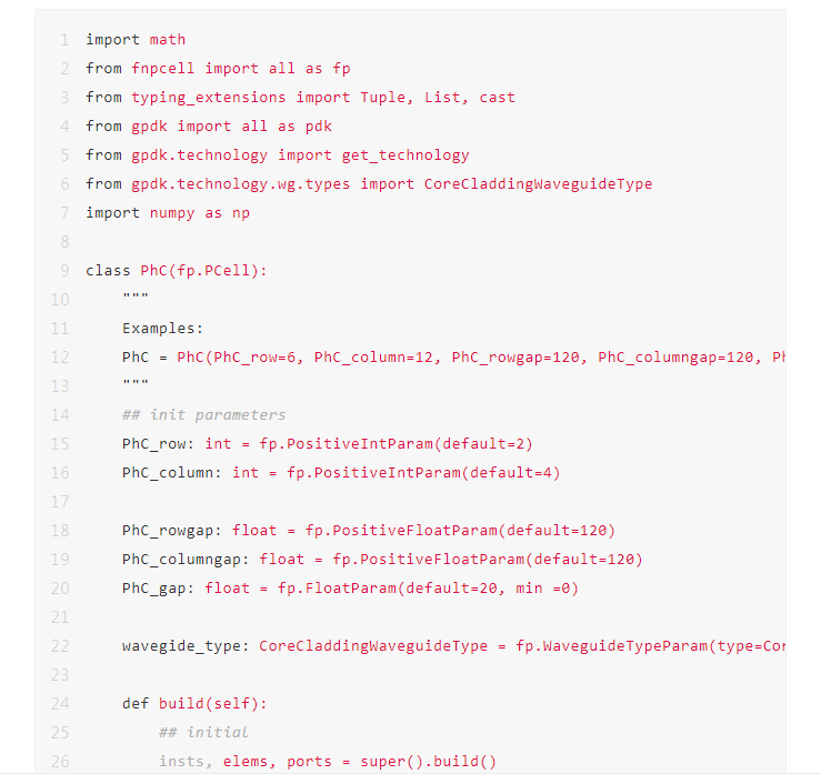 光子晶體為周期結構,基本單元也從傳統(tǒng)的單一規(guī)則結構演變成多個基本結構組合的結構到?jīng)]有規(guī)律的拓撲結構。教程提供的代碼從底層出發(fā),支持用戶自定義周期結構,在用戶定義的周期結構的基礎上通過幾個簡單參數(shù)即可實現(xiàn)任意光子晶體鏈路的搭建。