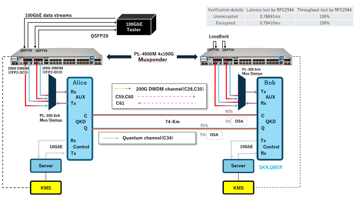 東芝在沖繩的長途QKD系統(tǒng)使用PacketLight的PL-4000M Muxponder在74公里的鏈路上傳輸兩個(gè)200G波長,量子信道運(yùn)行在1550nm上。使用100G測試儀測量鏈路性能,顯示z出100%吞吐量和低延遲,符合RFC2544標(biāo)準(zhǔn)。