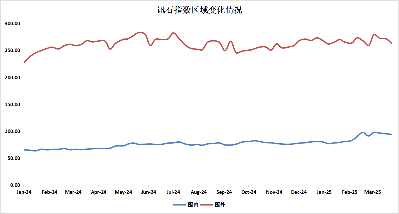 按地區(qū)劃分,截止到3月28日,ICC所統(tǒng)計的國內(nèi)通信指數(shù)為94.08,環(huán)比增長3.16%。國內(nèi)指數(shù)呈現(xiàn)增長趨勢。國外通信指數(shù)為263.2,較上月增長1.61%。國外通信股指在地緣政治與貨幣政策不確定性加劇市場震蕩,呈現(xiàn)下滑趨勢。