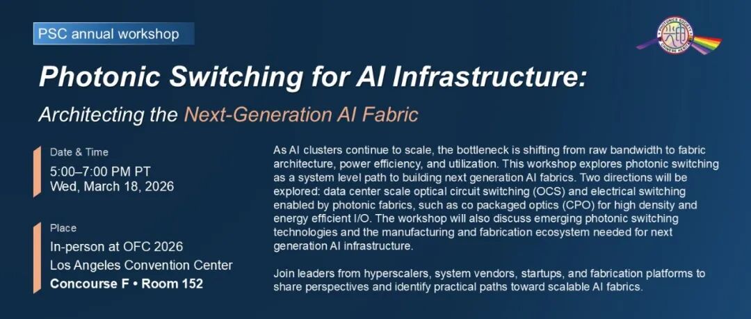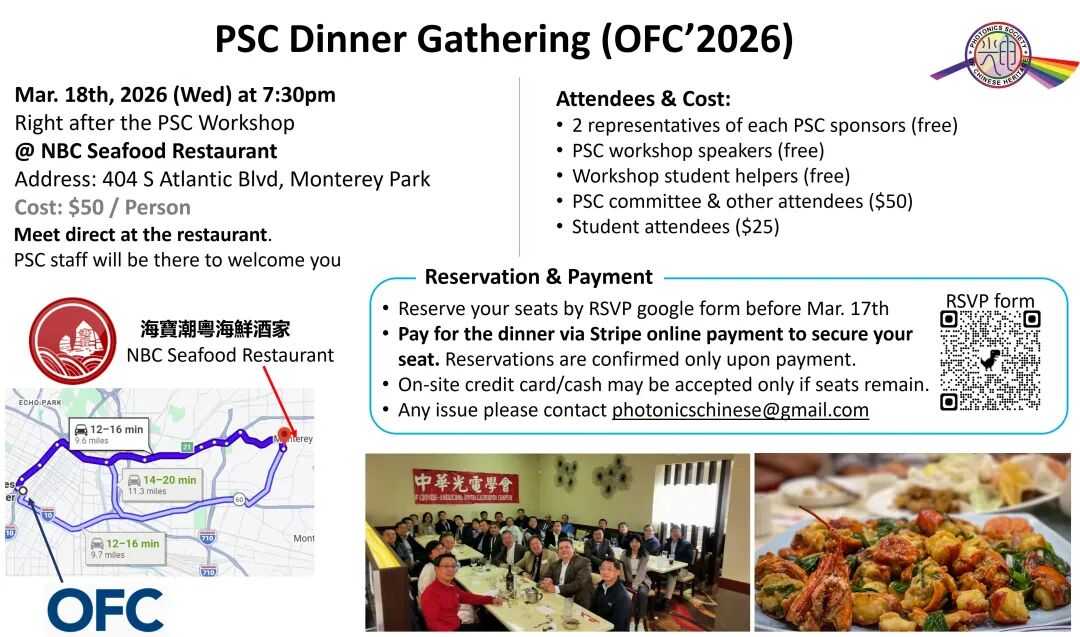 3月15日-3月19日,2026年度美國(guó)光網(wǎng)絡(luò)與通信研討會(huì)及博覽會(huì)(OFC)將在加州舊金山舉辦,吸引全球各地光通信行業(yè)人士參與。展會(huì)期間,PSC中華光電學(xué)會(huì)將在3月18日下午5:00舉辦2026年度研討會(huì)。本屆OFC中,我們將舉辦線下研討會(huì),并在會(huì)后舉辦晚宴交流會(huì),誠(chéng)邀光通訊、光電子領(lǐng)域企業(yè)人士、科研院校學(xué)者及投資行業(yè)朋友預(yù)約參加。