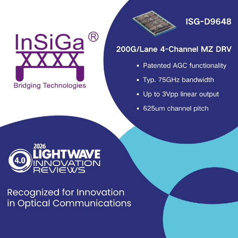ICC訊 近日,全球光網(wǎng)絡(luò)領(lǐng)域知名媒體Lightwave公布2026年度光通信創(chuàng)新大獎結(jié)果。英思嘉半導(dǎo)體榮獲三項通信半導(dǎo)體和電子芯片類創(chuàng)新大獎。Lightwave已連續(xù)多年評選光通信各技術(shù)領(lǐng)域的年度創(chuàng)新獎,旨在表彰光通信領(lǐng)域的頂尖產(chǎn)品和解決方案。在本屆創(chuàng)新大獎評選中,評審團給予了英思嘉三款產(chǎn)品4.0的高分肯定。